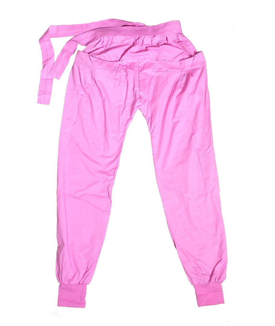 Hose mit tiefem Schritt, breites Modell, aus rosa Baumwolle. Modell mit großen Taschen, Taillengürtel und Fußfesseln.
