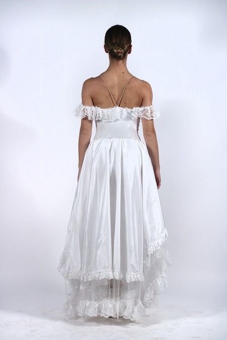 Maßanzug. Mieder aus Samt und Ausschnitt mit Spitzenvolant. Nackte Hosenträger. Weiter Rock mit asymmetrischem Schnitt aus weichem Tüll mit Rüschen aus steifer Spitze und Taft-Überrock mit asymmetrischem Schnitt und vollständig mit Spitze abgeschlossen.