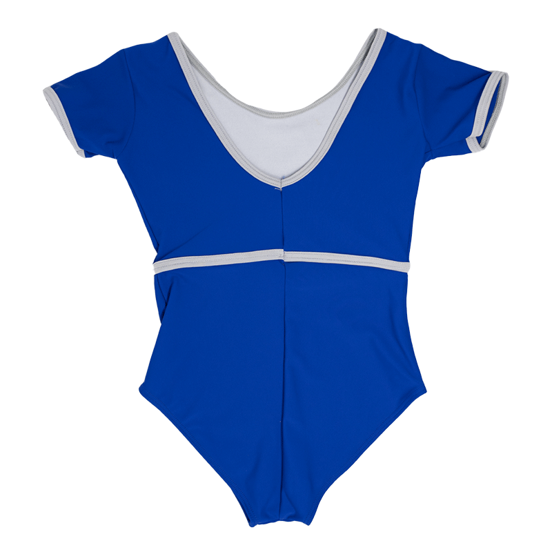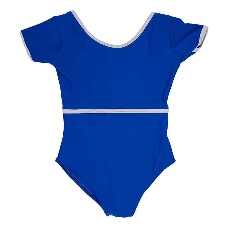 Dance leotard made of blue lycra with contrasting light blue edges along the neckline, sleeves and under the bust.