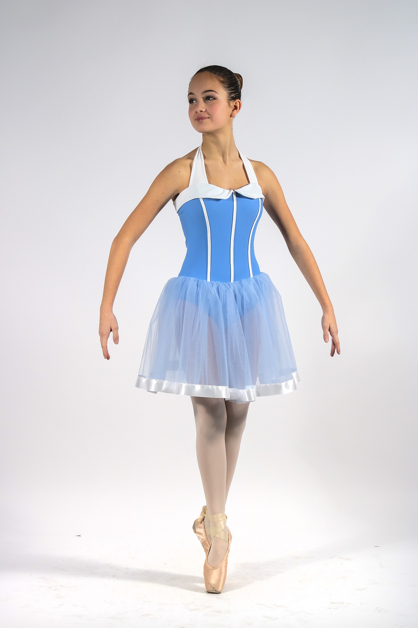 Swimsuit made in lycra. Sweetheart neckline bodice, finished with white appliqués at the neckline and along the neckline. Wide braces. Skirt made of tulle with edge finished in satin.