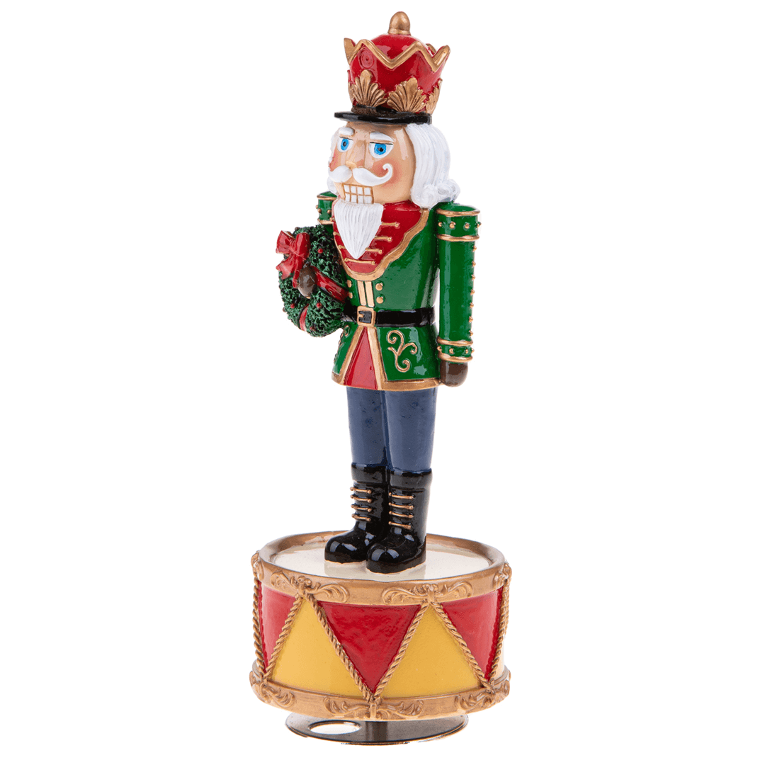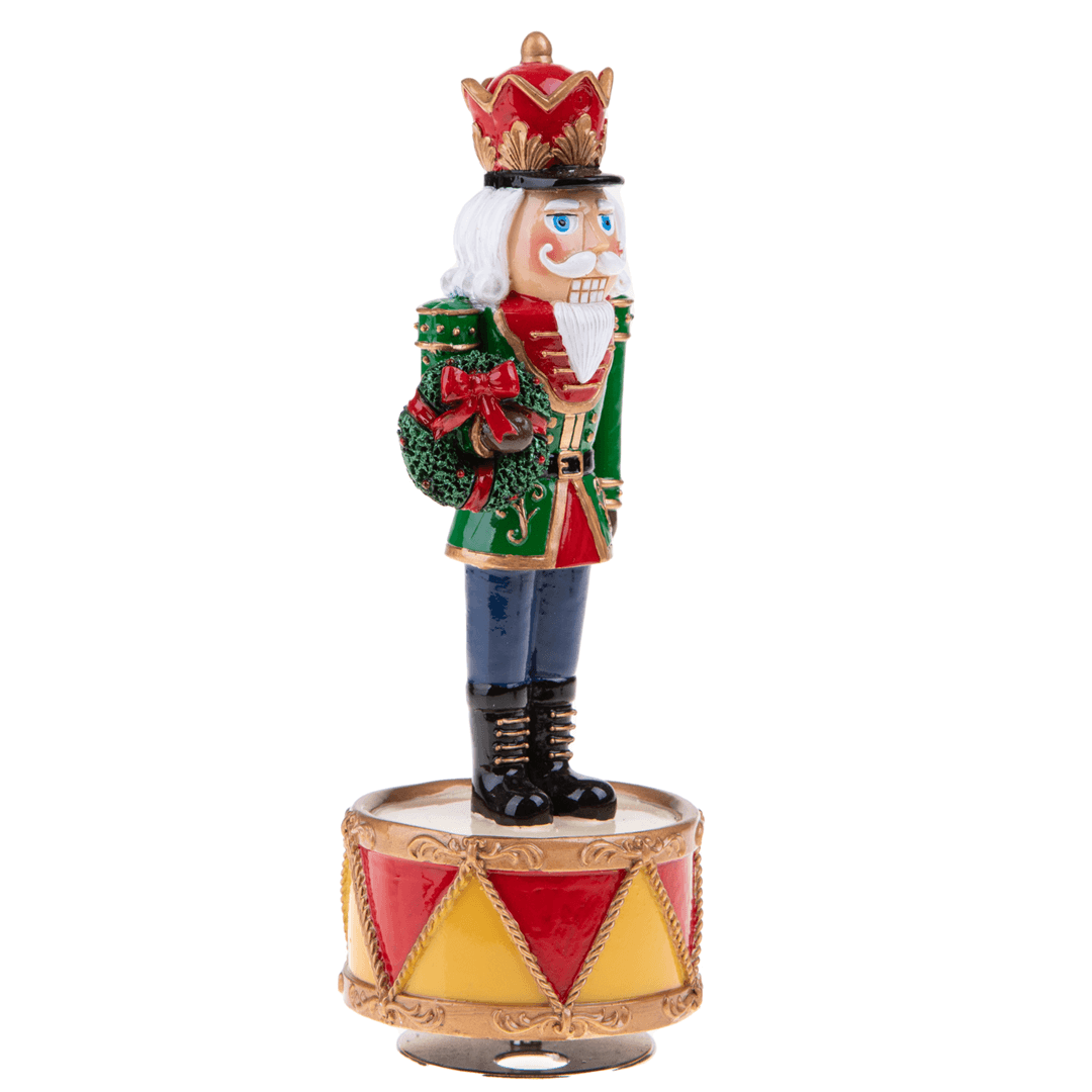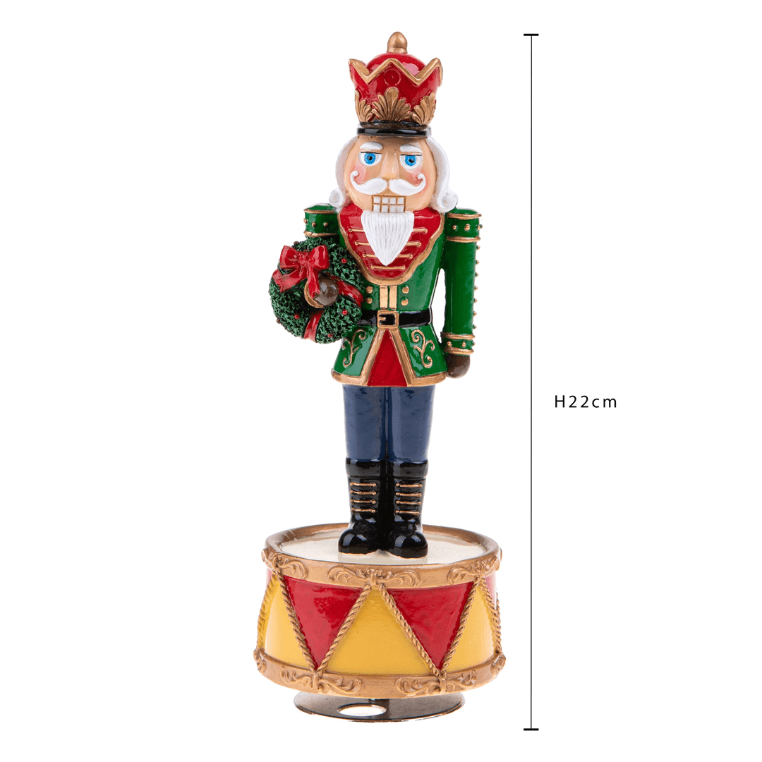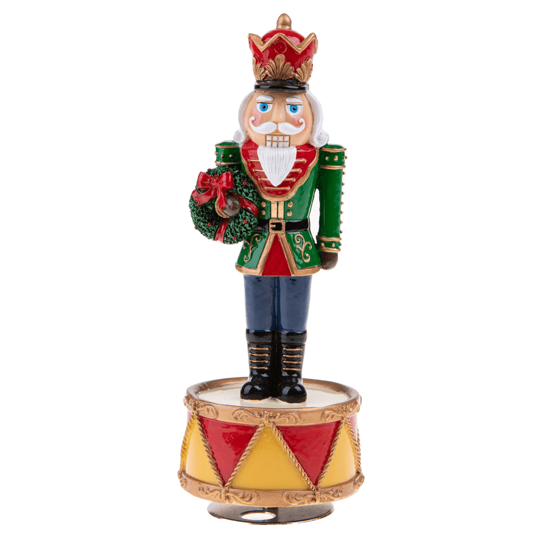 Realizzato in resina e dipinto a mano questo elegantissimo Carillon raffigura uno Schiaccianoci classico, simbolo iconico delle festività Natalizie e personaggio di rilievo dell’omonimo Balletto.