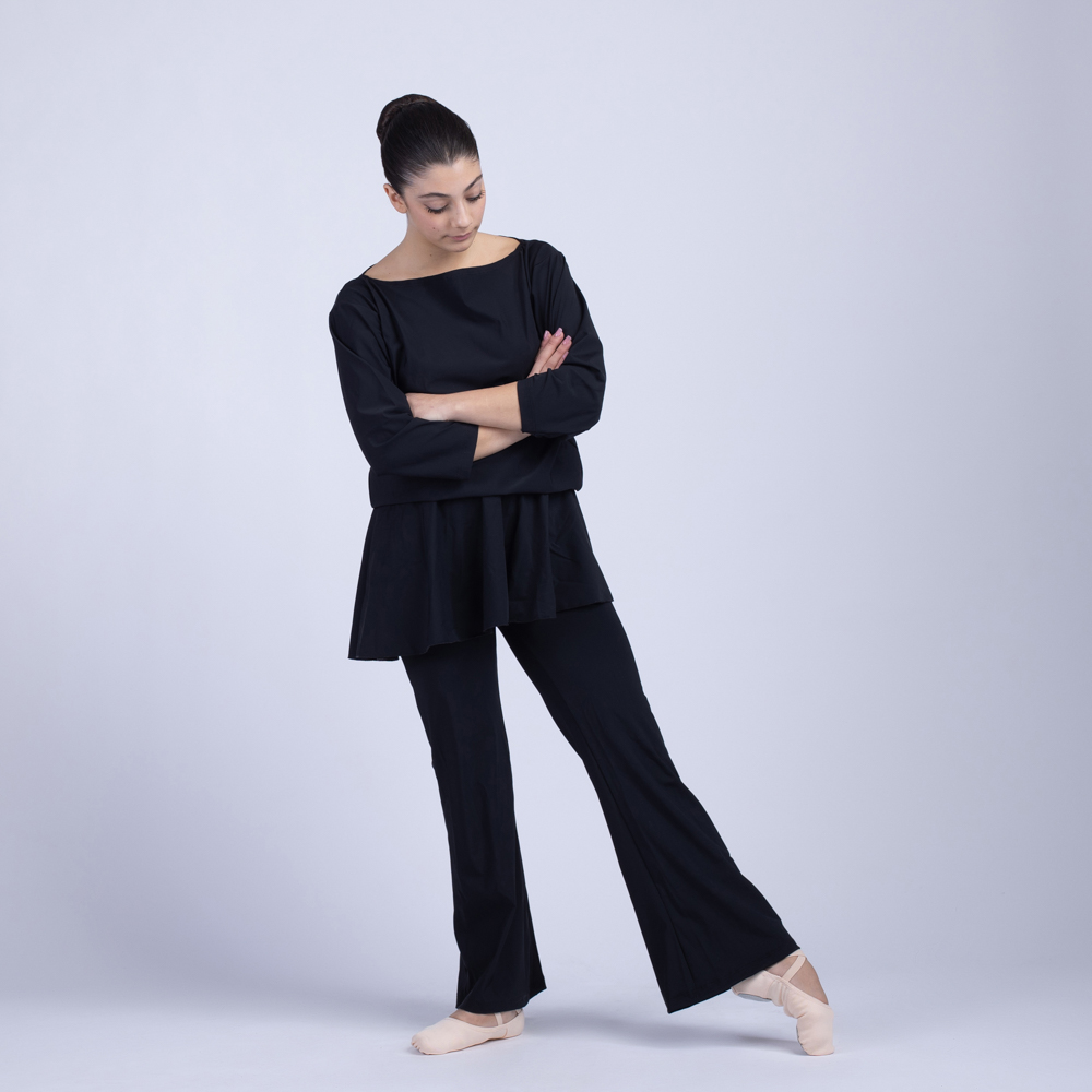 Completo da danza composto da 2 pezzi in tessuto morbido, ideale per insegnanti di danza classica. Maglia dal taglio comodo con scollo a barca e manica 3/4, abbinata a pantalone a zampa.
