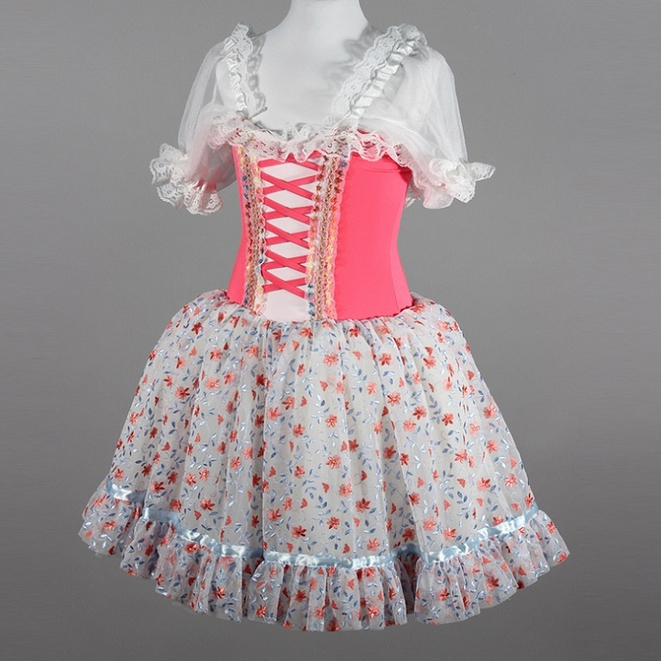 Scollo rifinito con merletto. Manica a palloncino in scintilla rifinita con nastrino e merletto, montata sulle bretelline. Gonna realizzata in tulle morbido e sopraggonna in rete ricamata a fiori e rifinita con nastrino
